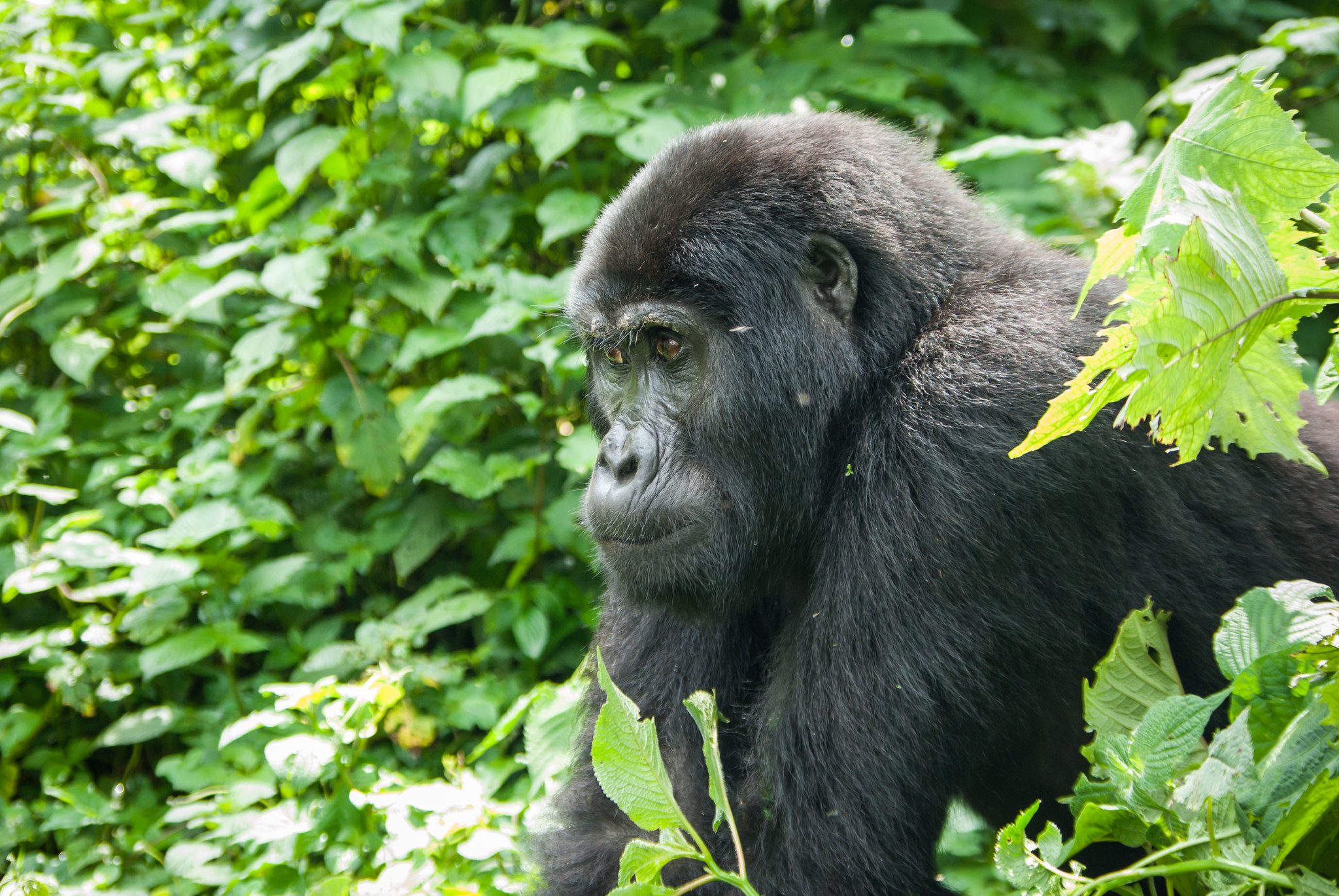 The Eastern Lowland Gorilla (Gorilla beringei graueri), also known as Grauer’s gorilla, is a subspecies of the Eastern Gorilla found only in the lowland and mid-altitude forests of eastern D.R. Congo. It is the largest of all gorillas by body size, with males weighing up to 210 kg (460 lbs) . Eastern lowland gorillas have shorter fur and a stockier build than mountain gorillas. Unfortunately, this subspecies has faced drastic declines due to decades of civil conflict in its range. In the mid-1990s, there were an estimated 17,000 Eastern lowland gorillas, but their population has since plummeted by more than 50% . Current estimates suggest fewer than 6,000 remain in the wild, making them Critically Endangered. The stronghold for Eastern lowland gorillas is Kahuzi-Biega National Park in the D.R. Congo, which protects the largest remaining population . Trekking Eastern lowland gorillas is possible in Kahuzi-Biega for adventurous travelers, as we will discuss, but ongoing unrest in the region has made conservation work and tourism challenging.